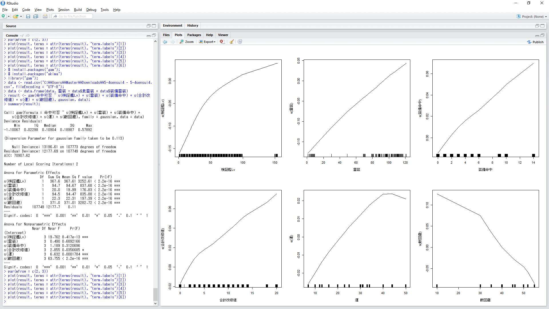 result <- gam(命中可否 ~ s(検証艦Lv) + s(雷装) + s(装備命中) + s(合計改修値) + s(運) + s(敵回避), gaussian, data);