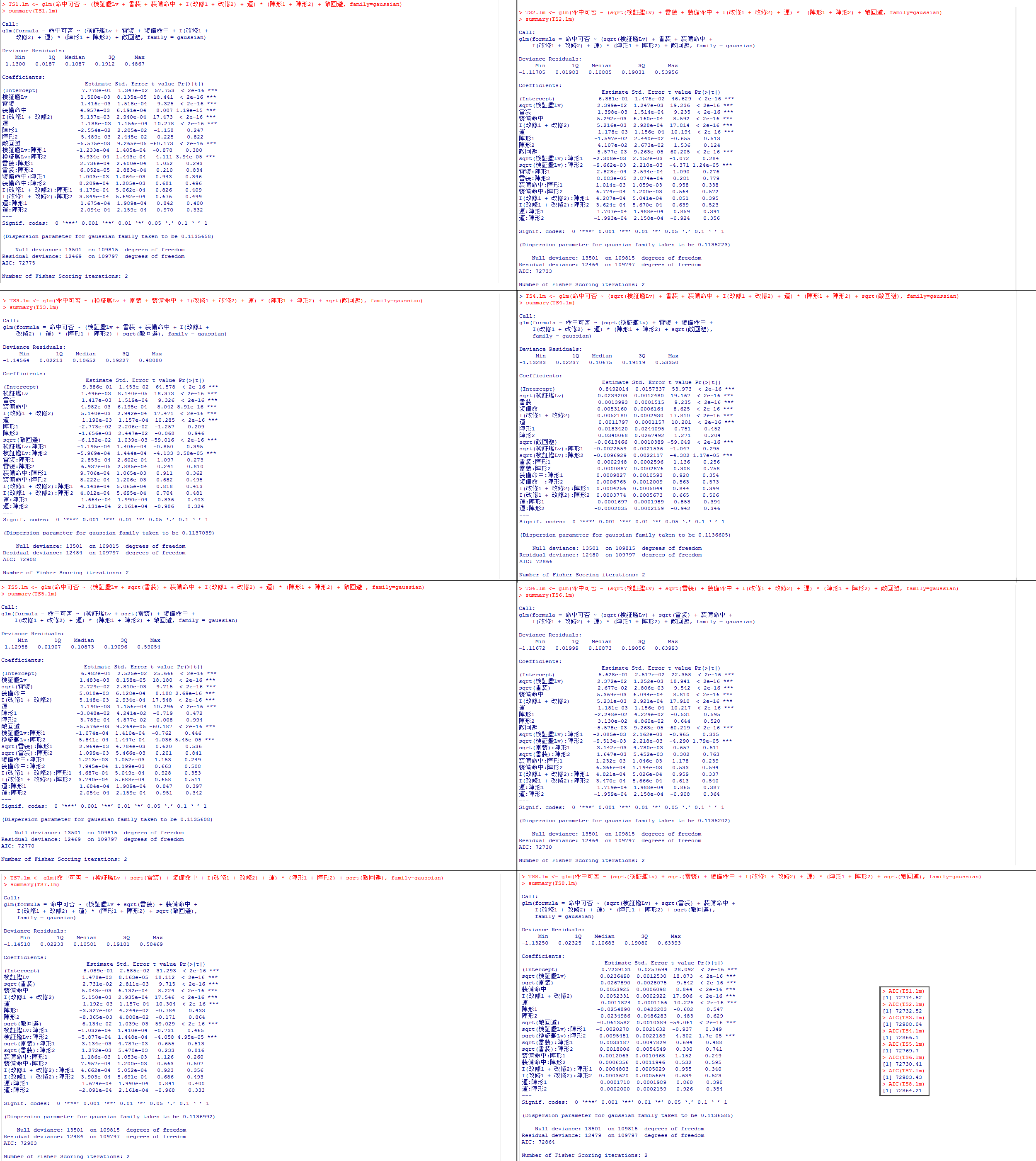 TS8.lm <- glm(命中可否 ~ (sqrt(検証艦Lv) + sqrt(雷装) + 装備命中 + I(改修1 + 改修2) + 運) * (陣形1 + 陣形2) + sqrt(敵回避), family=gaussian)