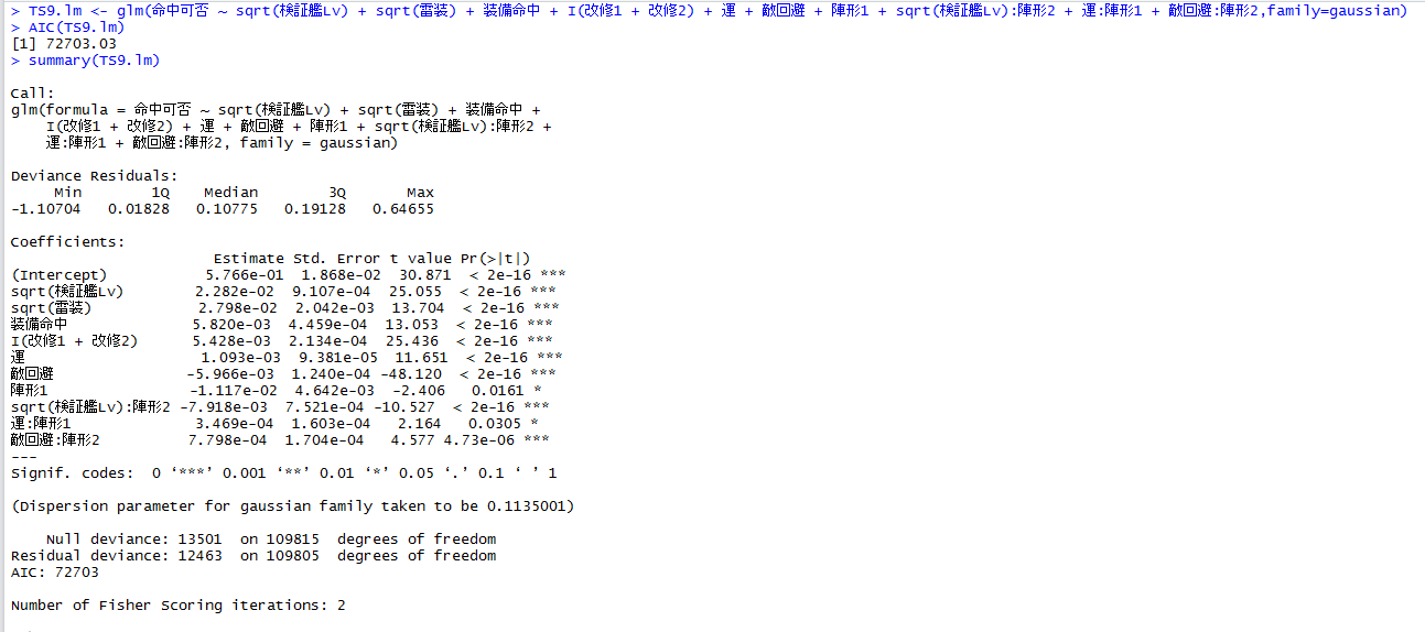 TS9.lm <- glm(命中可否 ~ sqrt(検証艦Lv) + sqrt(雷装) + 装備命中 + I(改修1 + 改修2) + 運 + 敵回避 + 陣形1 + sqrt(検証艦Lv):陣形2 + 運:陣形1 + 敵回避:陣形2,family=gaussian)