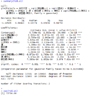 TS6.lm <- glm(命中可否 ~ (sqrt(検証艦Lv) + sqrt(雷装) + 装備命中 + I(改修1 + 改修2) + 運+ 敵回避) * (陣形1 + 陣形2), family=gaussian)