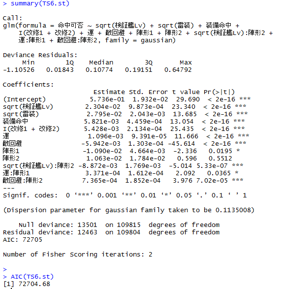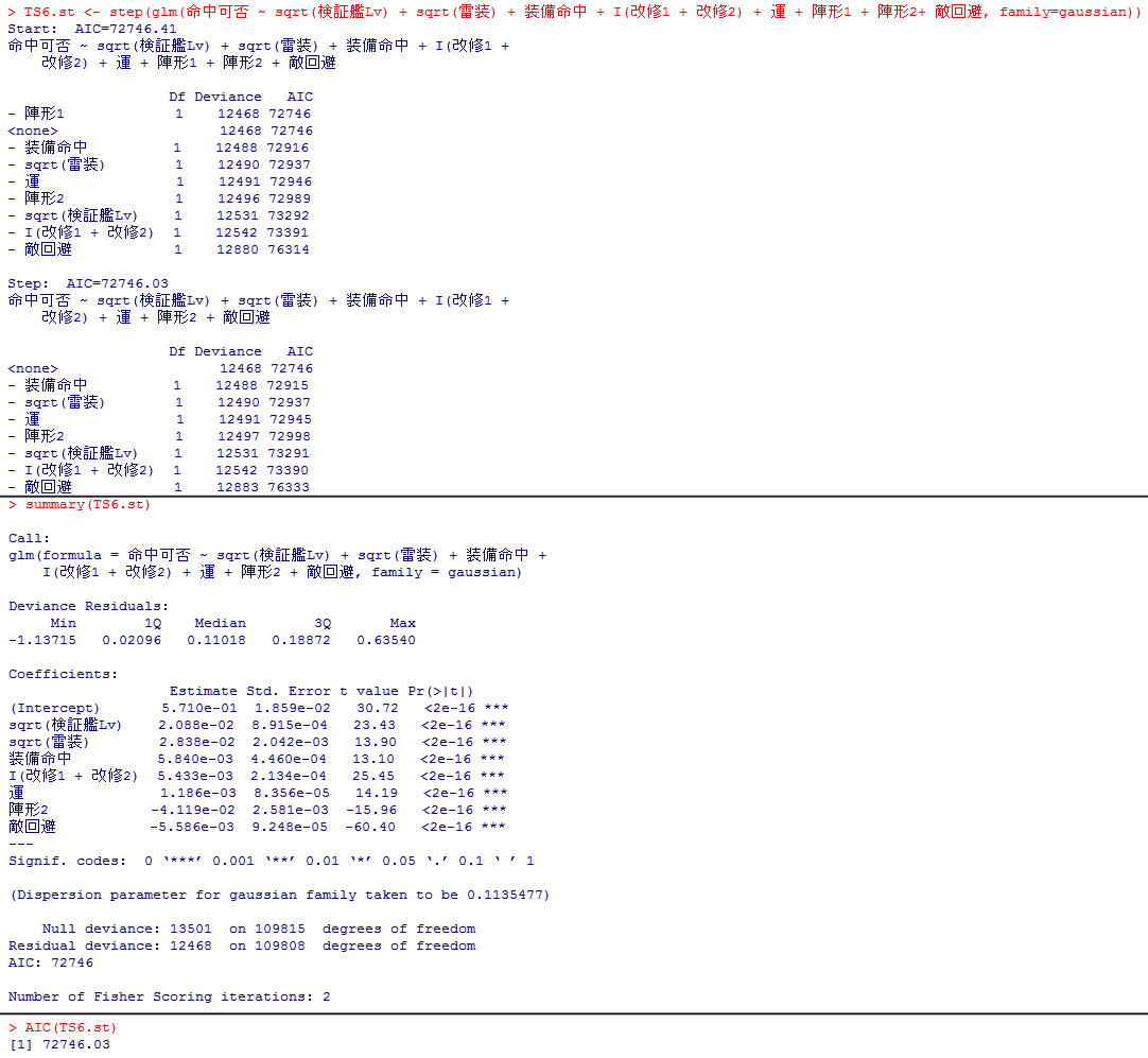 TS6.st <- step(glm(命中可否 ~ (sqrt(検証艦Lv) + sqrt(雷装) + 装備命中 + I(改修1 + 改修2) + 運) * (陣形1 + 陣形2) + 敵回避, family=gaussian))