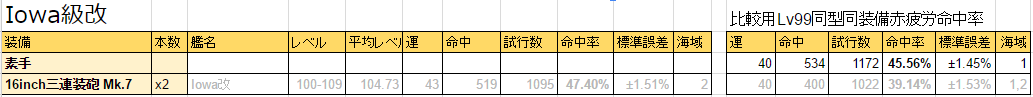 <figcaption> </figcaption></figure>500試行だと心許なかったので、各1000試行まで増やして46cm以外の過重砲でケッコン補正の確認