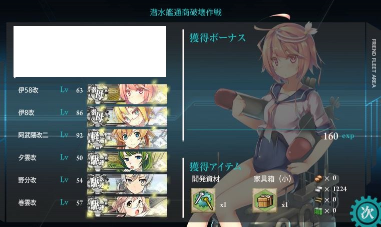 <figcaption> </figcaption></figure><p>陸戦隊★4 潜水艦通商破壊作戦大成功の結果(増えていなかったので装備画像は付いていません)