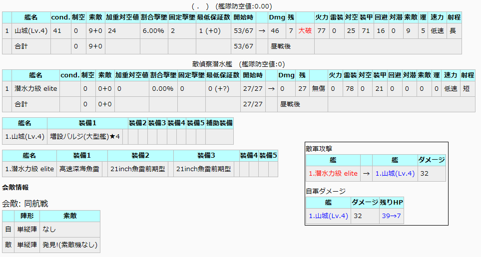 <p>装甲71の山城(増設バルジ(大型艦)★4装備)で1-5-1のカ級eliteの雷撃で被ダメージ検証