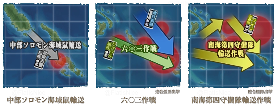 - Отправка Сёндай Кай Ни на карту E-2 в первой фазе, с использованием одиночного флота, даст ей привязку зелёного цвета. Теперь она может быть отправленна только на E-2 с использвоанием одиночного флота с другими кораблями с зелёной привязкой или без привязки.