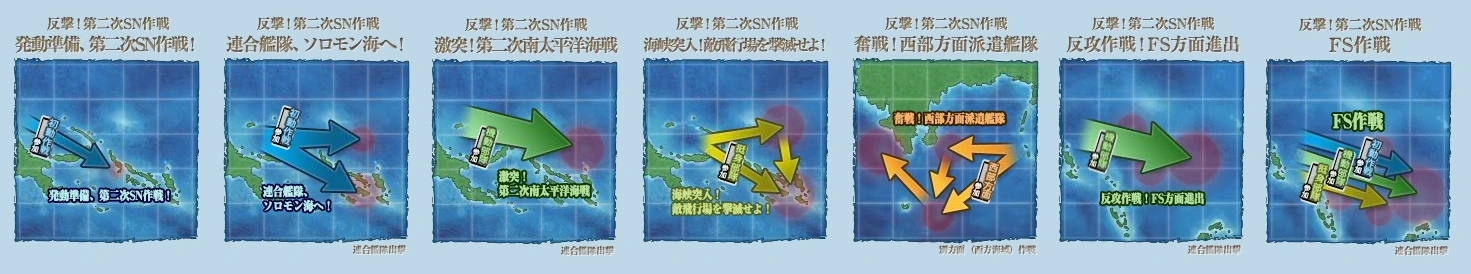 - Yêu cầu về đường đi Bạn phải tuân theo một số yêu cầu đặc biệt về vị trí + số lượng các tàu trong hạm đội để có thể đi đường ngắn hơn hoặc dễ hơn, hoặc chỉ đơn giản là để có thể đặt chân tới được boss. Các yêu cầu bao gồm Loại tàu (ví dụ CAV, CL, SS hoặc LHA....) và Tốc độ của tàu, cộng với số tàu thuộc loại đó mà bạn được phép có trong hạm đội.