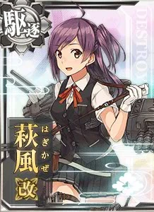 陽炎型駆逐艦、十七番艦、萩風です。浦賀生まれです。嵐と一緒に第四駆逐隊で頑張りました。南雲機動部隊の直衛、ソロモンの死闘を経験しました。最後の夜も嵐と一緒です。私たち四駆のこと、覚えていてくださいね。 | Em là Hagikaze, khu trục thứ 17 của lớp Kagerou. Em sinh ra tại Uraga.Em làm việc với tư cách 1 phần của đội khu trục số 4 với Arashi. Là tàu hộ tống của lực lượng đặc biệt Nagumo ,Em đã tham gia vào trận chiến không khoan nhượng tại quần đảo Solomon.Em đã ở cùng với Arashi vào đêm cuối đó. Xin nhớ đến chúng em, Đội khu trục thứ 4. | Trận chiến vùng xoáy Vella, là trận cô đã chìm cùng Kawakaze và Arashi. | |