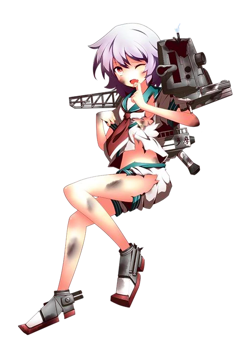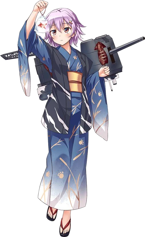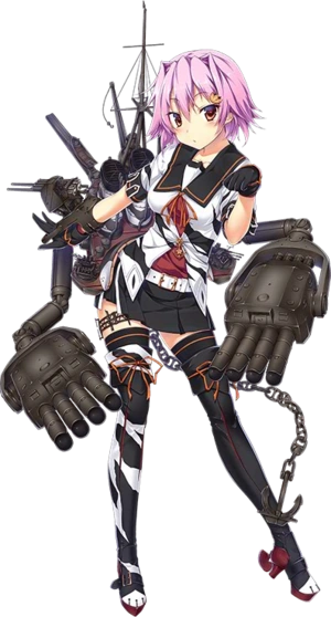 - Cô có đôi mắt đỏ cùng mái tóc ngắn màu hồng/tím nhạt. Cô mặc một bộ serafuku (đồng phục thủy thủ) màu trắng với những họa tiết màu xanh lục ở cổ áo và ống tay, cùng quần ngắn và một chiếc khăn quàng màu đỏ. Cô thường đi chân trần.