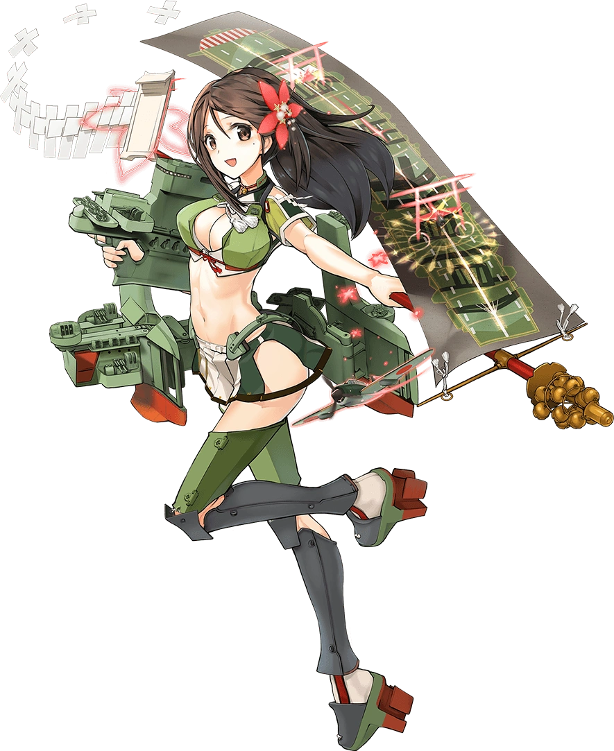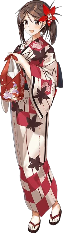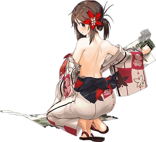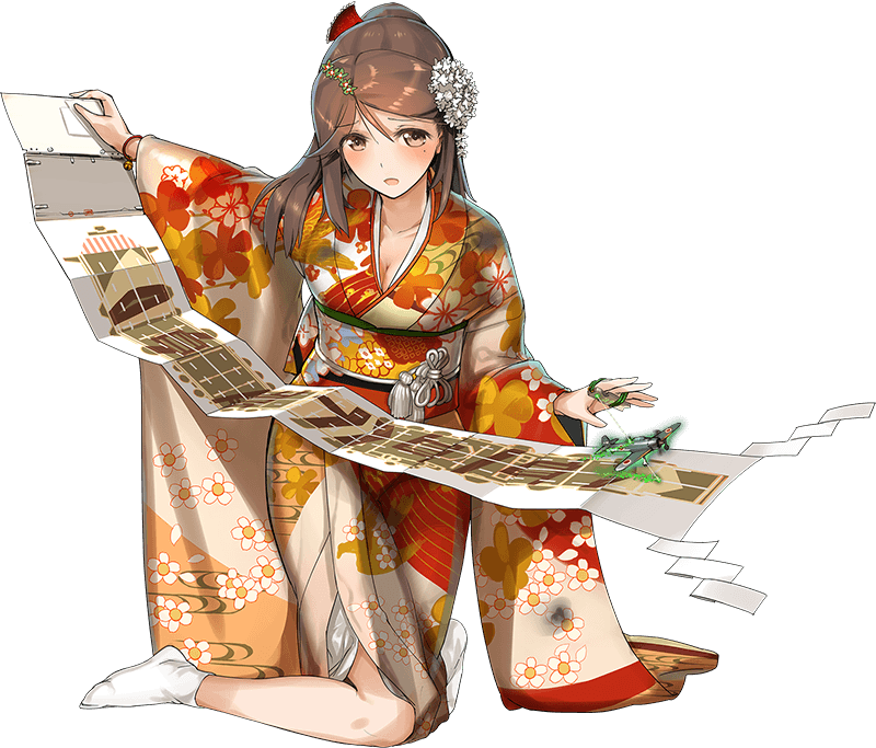 - Unremodelled, she wears a patterned furisode with her flight deck in guise of a obi (as it is simply too short, a clip-on bow is attached to it) and her banner-rod is wrapped on her back. This actually represents how she wasn't given any planes and was camouflaged in Kure, never to be used in any meaningful way. When damaged, she has a distinctive and unusual pose lying down upon her side, revealing her Unryuu-class gear underneath the furisode.