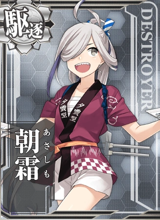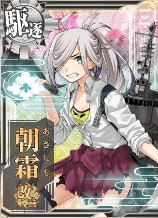 | Kai | よお! 夕雲型駆逐艦、十六番艦の朝霜。いつでも出撃できるぜ。まだまだ暴れよう! …なぁ! 司令! | Yo! It's the 16th Destroyer of the Yuugumo class, Asashimo. Always ready, never stop rampaging! Eh commander? | ||