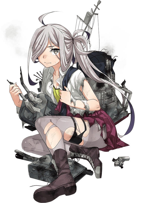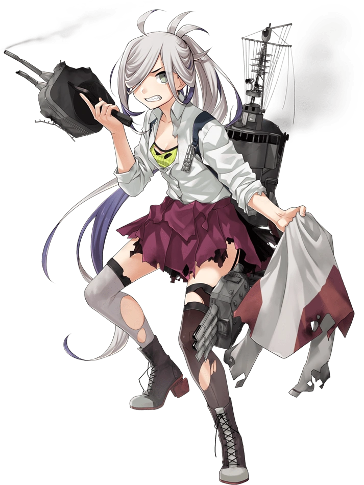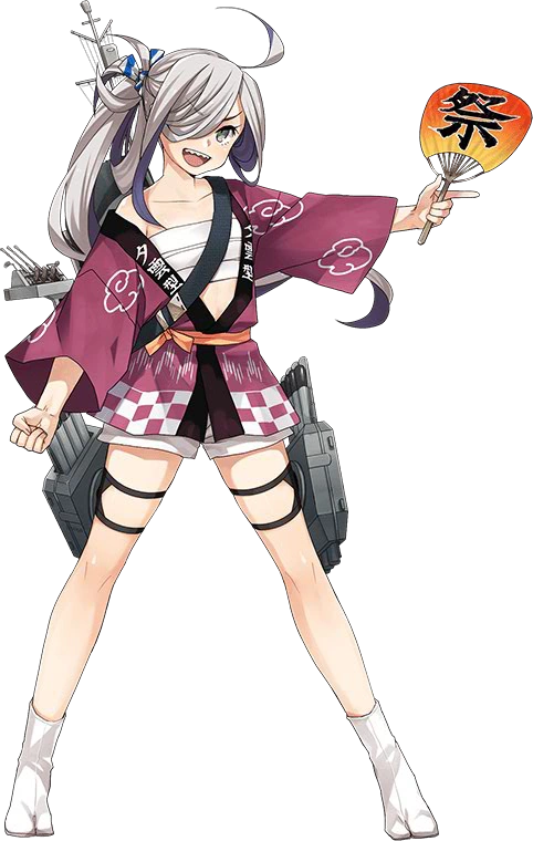 - On remodel, she gains a white headband, AA guns and a single thighhigh on her left leg is overlaid on her pantyhose (emulating Yamato as an Operation Ten-Go participant).