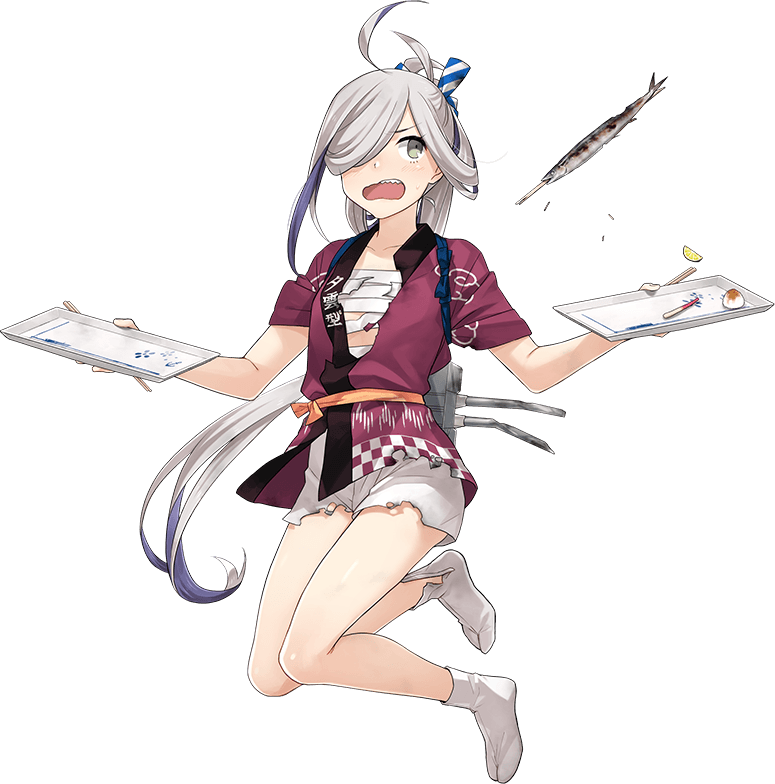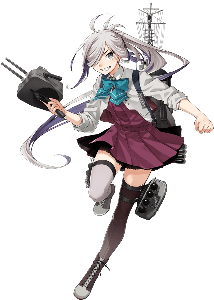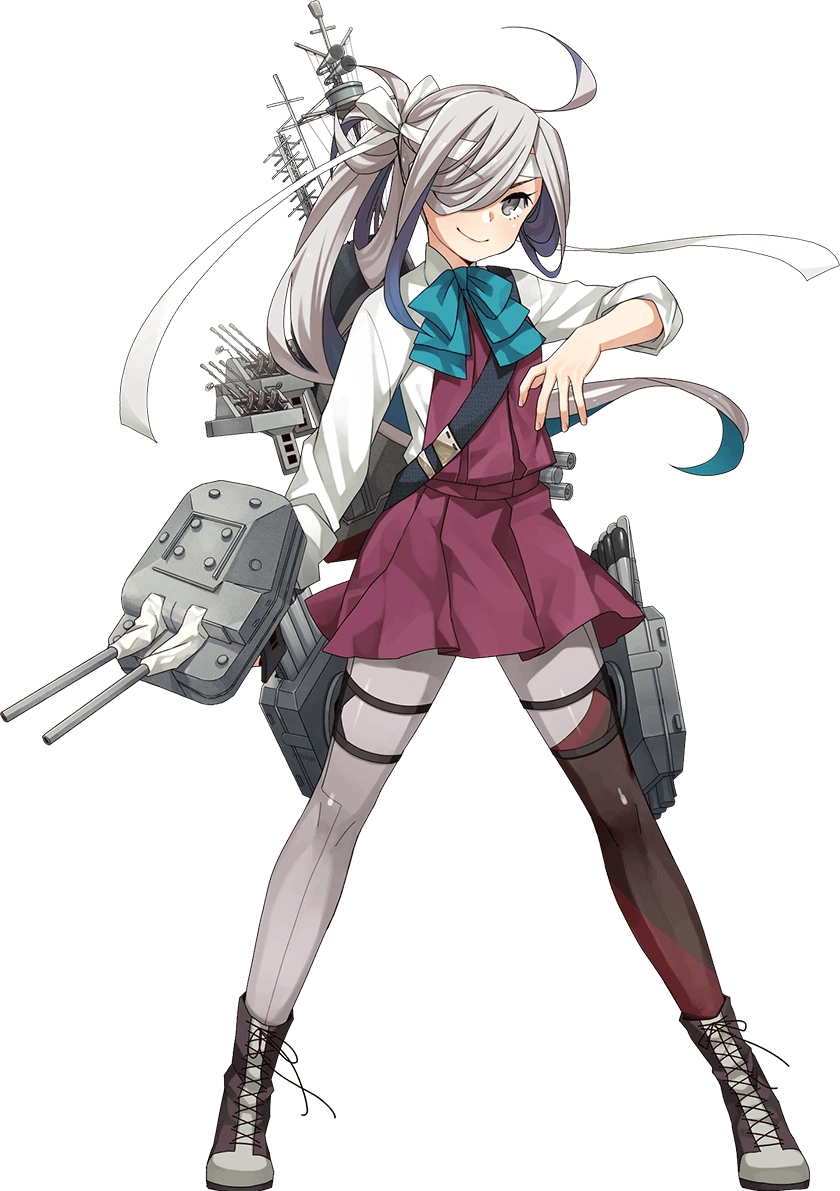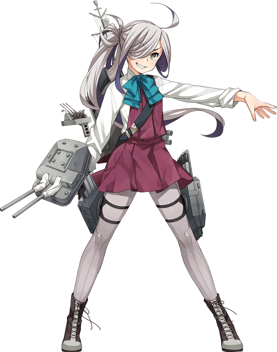 - She wears the standard Yuugumo-class school uniform which consists of a purple sleeveless dress over a white shirt, a teal-blue bowtie andgrey/purpleopaque pantyhose with lace-up boots. She wears her rigging on her back as a backpack, it has a single black strap. Quadruple torpedo launchers are strapped to her thighs and she wields a standard 12.7cm gun with her right hand.