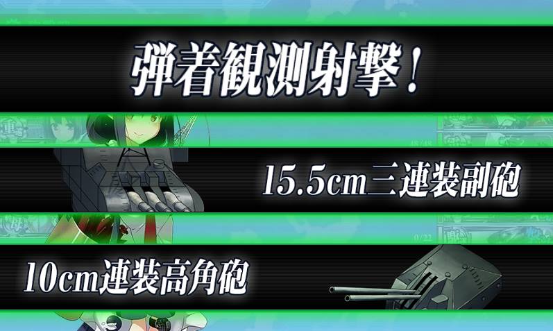 Certain equipment setups provide a chance to trigger special attacks during day battle, giving boost to both attack power and accuracy. The damage modifiers are applied after the cap (180), thus very effective against heavy armor targets. Note that the ship requires at least 1 seaplane on board to perform Artillery Spotting.