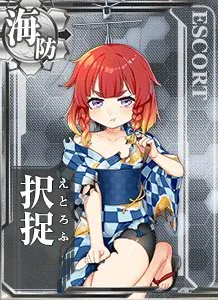| Library | 択捉型海防艦の一番艦、択捉です!先輩の占守型の改良型です。生産性と爆雷装備数などが向上しているの。たくさんの姉妹が船団護衛の任などに就きました。最後まで戦えた艦は多くはなかったけど、後方の海を最後まで護り抜きました。戦いが終わった後も、少し頑張らせて頂きました。 | I'm the first ship of the Etorofu-class coastal defense ships, Etorofu. I'm an improved version of my seniors, the Shimushu. My engine power and depth charge equipment were improved. A lot of my sisters were sent to be fleet escorts. Even though not a lot of us were left fighting at the end, we protected the home waters to the last. Even after the battle was over, I kept doing my best. | ||