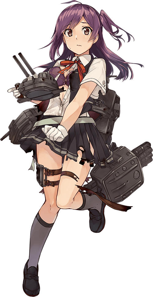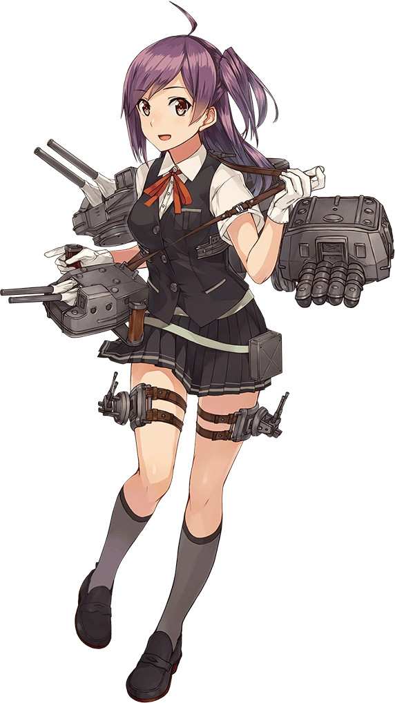 - She has yellow eyes and long purple hair with an ahoge. Her hair is tied into a side ponytail similar to Kaga's, continuing a Kantai Collection trend of matching a few traits from escort ships to the ships they escorted. (Other commentators note a distinct likeness to Shimamura Uzuki of iDOLM@STER Cinderella Girls.)