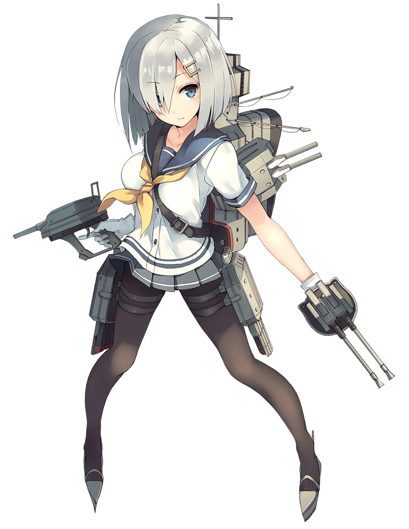 - She wears a short-sleeved white and blue button-up serafuku with a yellow scarf (similar to Yukikaze) on top of a Kagerou-class standard pleated skirt with black pantyhose under everything. On her back is her rigging. Like most of the Kagerou-class, she wears white gloves. She wields two pistol-like guns, one resembles the standard 12.7 cm twin gun, the other resembles an Anti-Air gun.