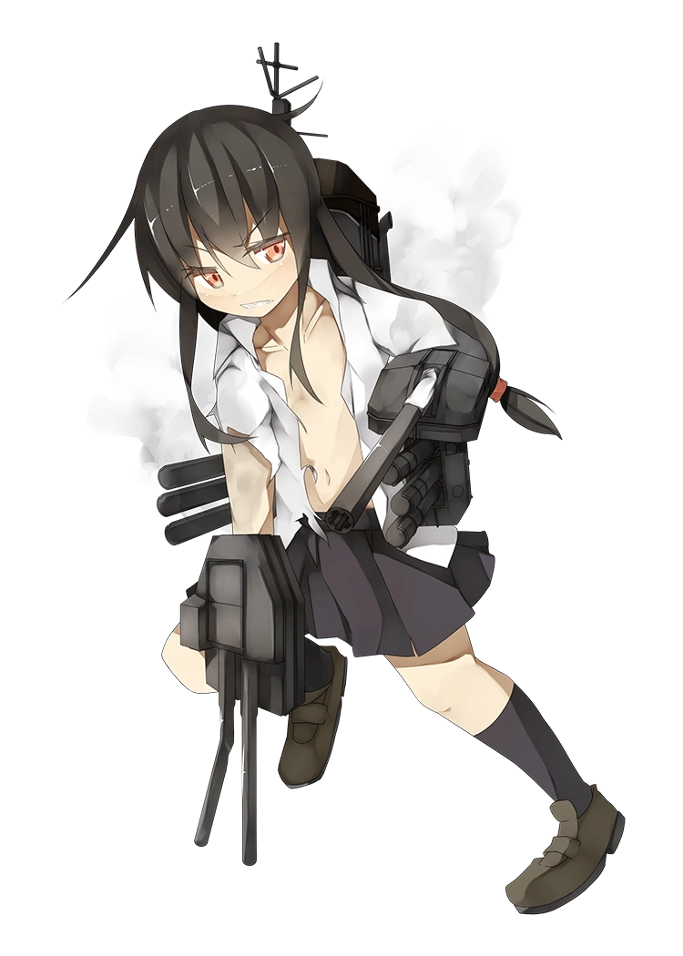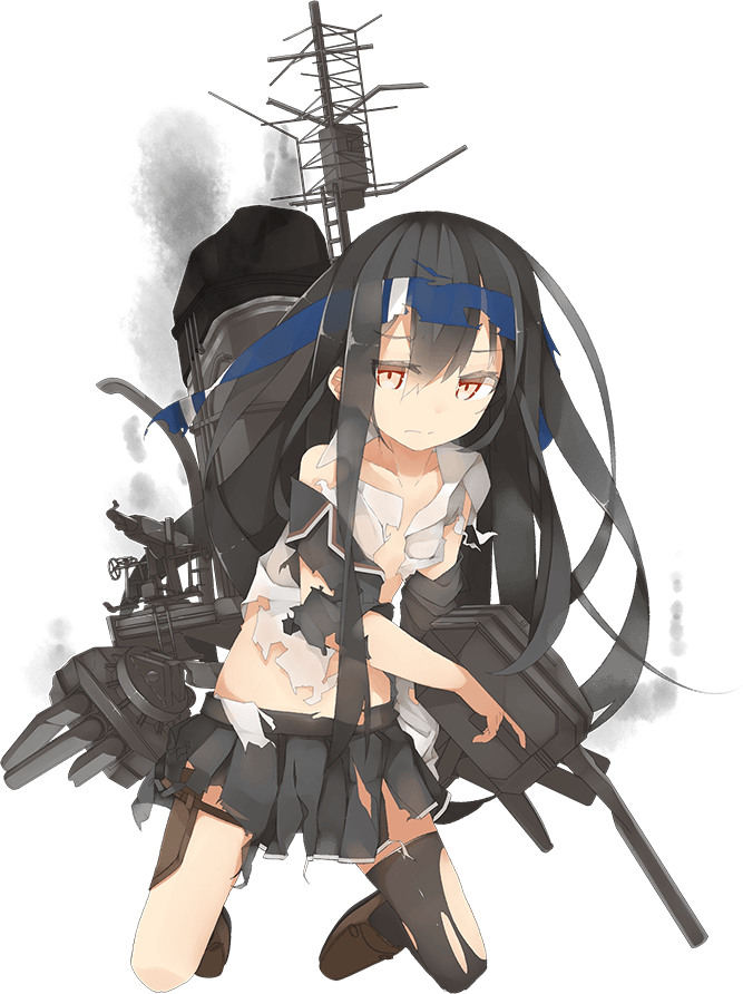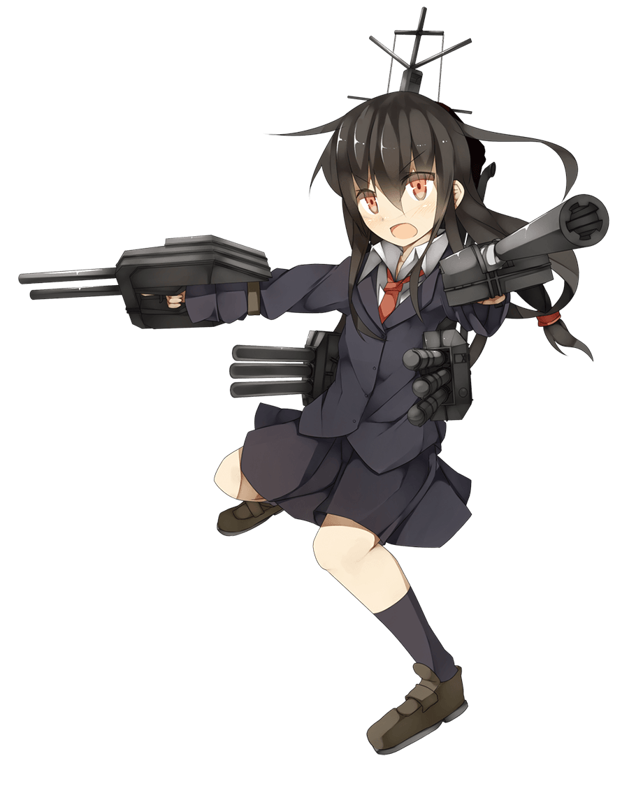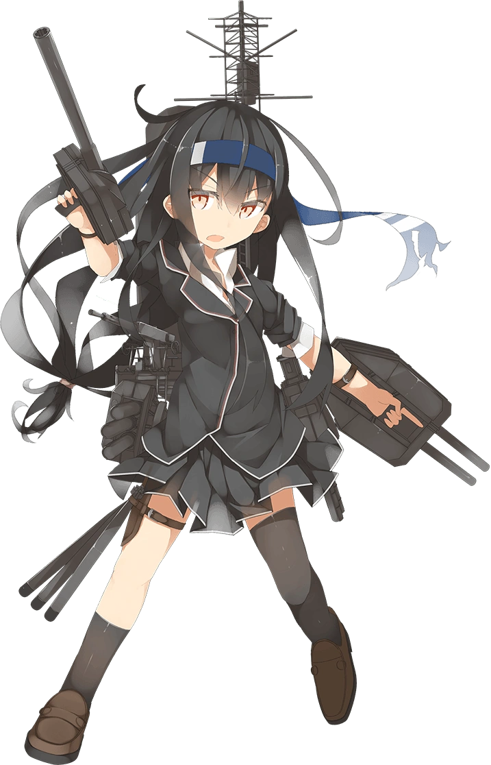 - She holds two small main cannons in both hands resembling dual 12.7cm naval guns, though the left gun only has a single turret (which was the standard for Hatsuharu class destroyers until post-1942 when they were replaced with additional anti-air guns), with 61cm triple torpedo mounts attached to either side of her torso. Her mainmast and funnel, mounted on her back, are apparent as well.