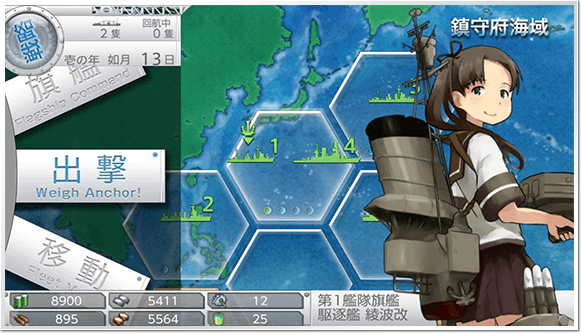 You can see the current sea area name on the top right-hand corner, the flagship kanmusu (ship girl) of the selected fleet on the right hand side of the screen, the resources information down below it on the left hand side, the information about the current turn on the top left hand corner, and the commands you can choose to the left. Your fleet deployment status will be displayed on the central map. You can sortie your kanmusus to combat a sea area, move your kanmusus to a nearby sea area, assign convoys, and the like to different sea areas to secure regions and obtain resources here. Pressing the R button goes back to flagship admiral room.