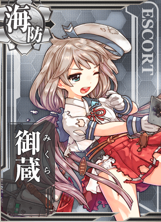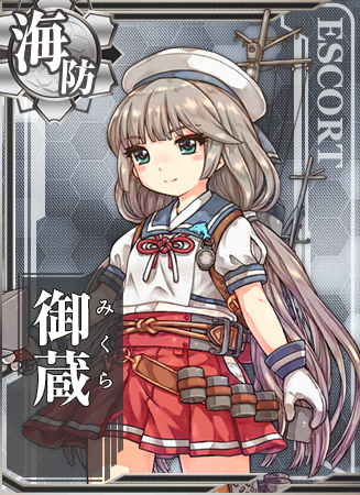 | Introduction | 御蔵型海防艦、一番艦、御蔵。着任します。 提督、御蔵型、何卒よろしくお願い致します。 体は小さいですが、力の限り、務めます。 |