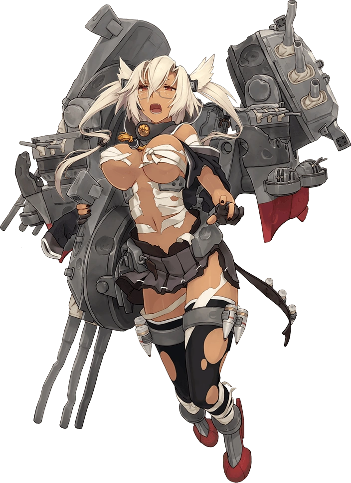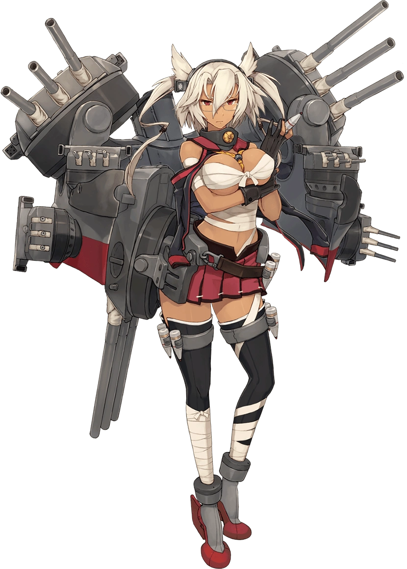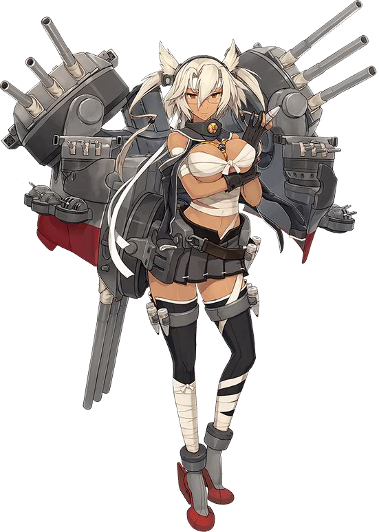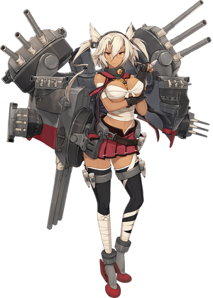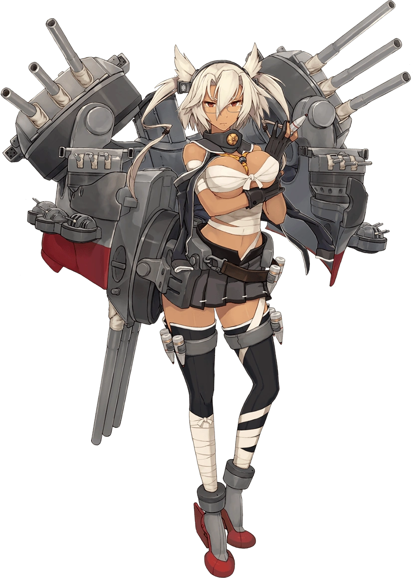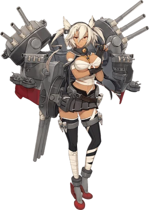 - Her combat gear includes a large, back-mounted "split hull" design with smokestacks behind her back, and battleship hull-like arms bristling with multiple triple-cannon turrets, both larger "main guns" hanging over her shoulders and smaller "secondaries" popping out of the sides of the hull. A third "main gun" is clamped to her right thigh. Also on her thigh, she has armor piercing ammo cartridges strapped to metal garter straps. She also wears armored high-heel like boots with rudders for heels.
