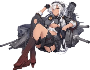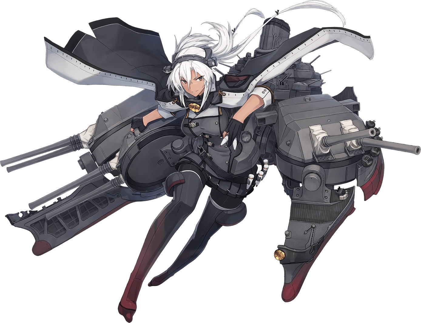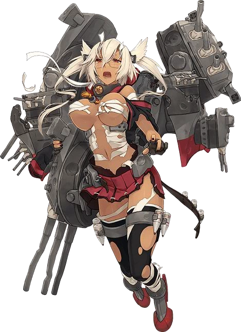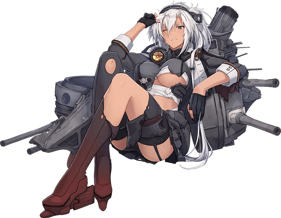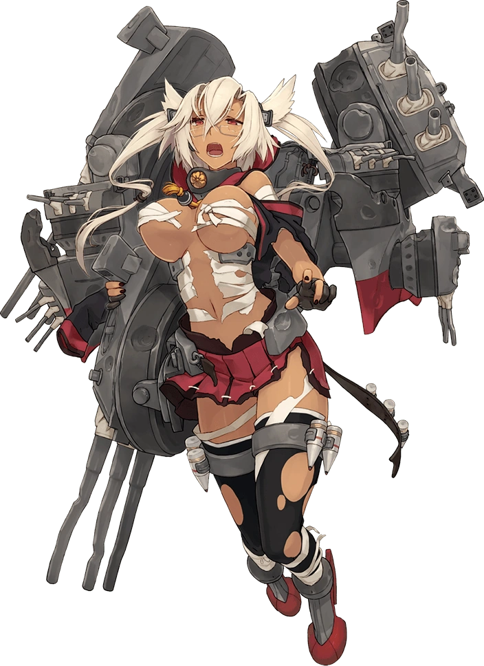 - Her combat gear includes a large, back-mounted "split hull" design with smokestacks behind her back, and battleship hull-like arms bristling with multiple triple-cannon turrets, both larger "main guns" hanging over her shoulders and smaller "secondaries" popping out of the sides of the hull. A third "main gun" is clamped to her right thigh. Also on her thigh, she has armor piercing ammo cartridges strapped to metal garter straps. She also wears armored high-heel like boots with rudders for heels.