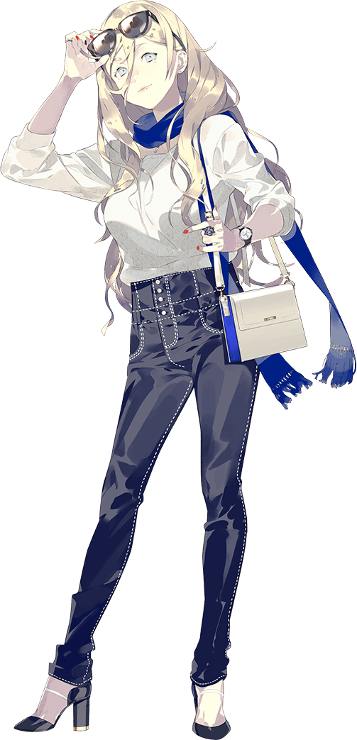 Her costume includes a large, loose white beret with a red pom-pom accesory on top and a long black ribbon attached to the back, a red-grey-black square-motif scarf that reaches her feet, a one-piece black-white-grey dress, a large white belt secured just under her breasts, black-white gloves, a tricolore scarf tied onto her left arm, black-white stockings, and loafers with gold anchor accesories on top.