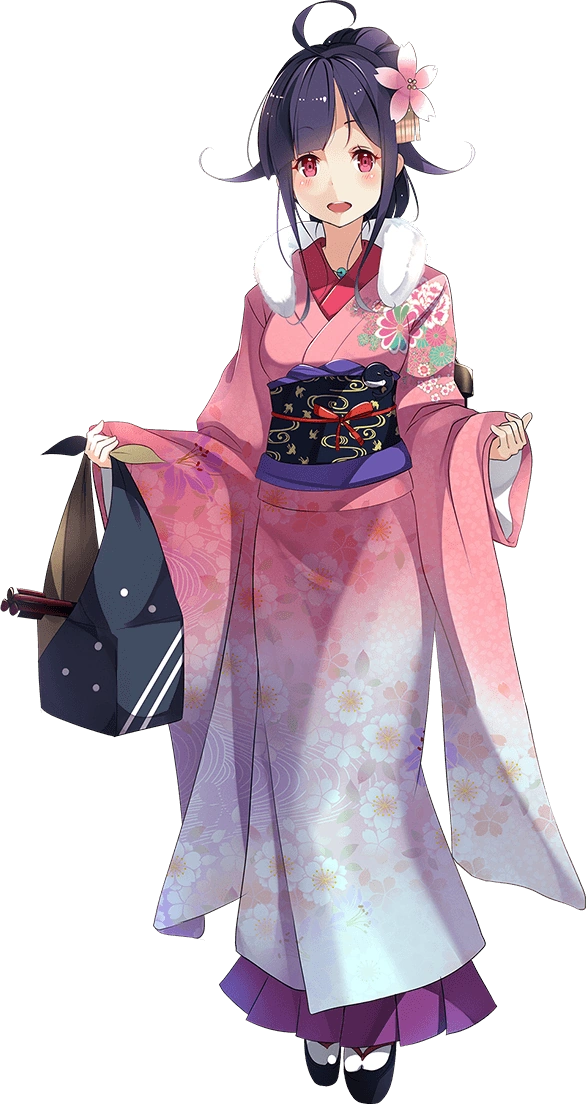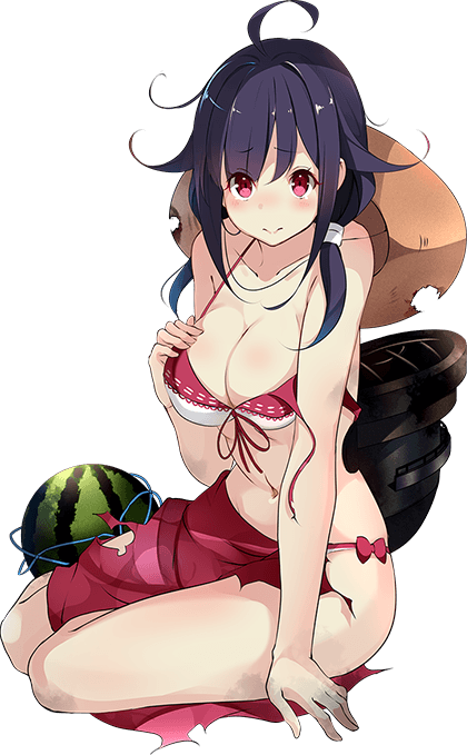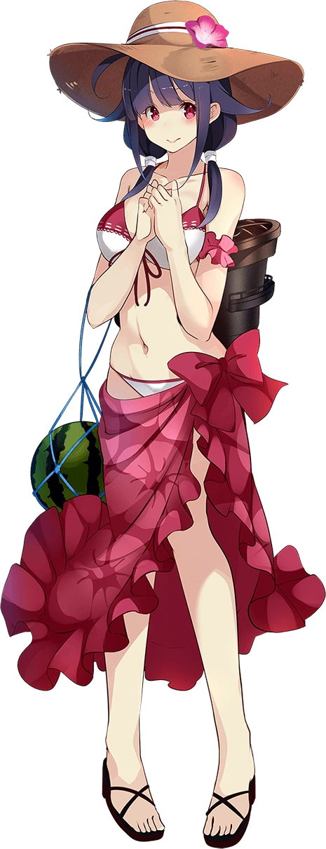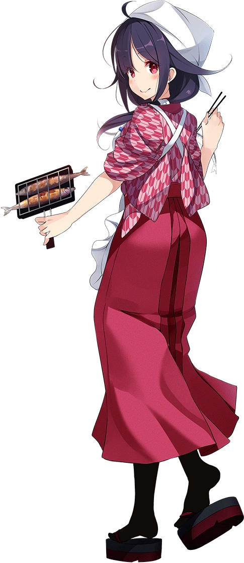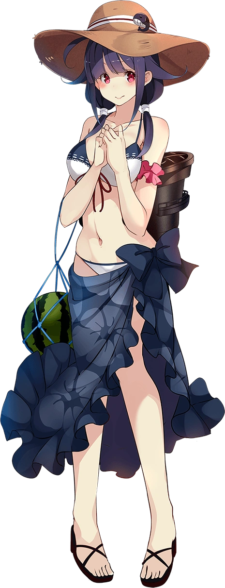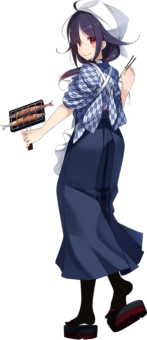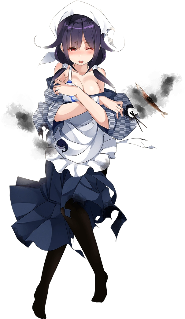 - As Taigei, she is depicted as having pinkish-red eyes and has dark purple hair that reaches her shoulders tied in low twintails with hair flaps and an ahoge, she also has sizeable bust. On her neck, she wears a blue necklace known as a magatama. Her usual outfit consists of a white serafuku with blue accents with a red necktie and blue miniskirt with white accents to contrast the color of her necktie, along with wearing black pantyhose. She wears an apron with an image of a whale (as her name suggests) over her serafuku. Her rigging is placed on her back and she is seen carrying a bag of torpedoes and a bucket of food, due to her role as a submarine tender. An AA turret is seen on her left wrist. She wears sandals with small rudders acting as heels.