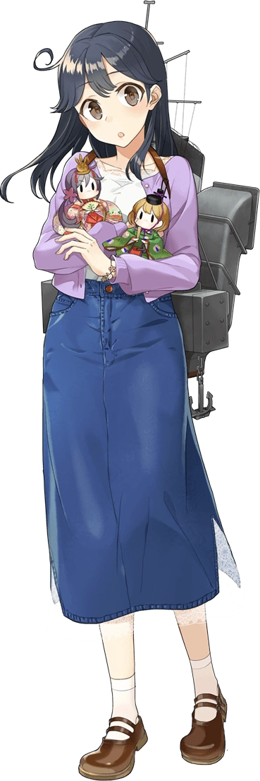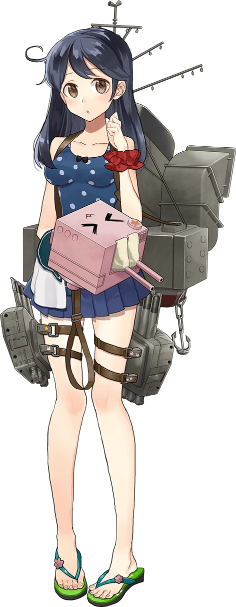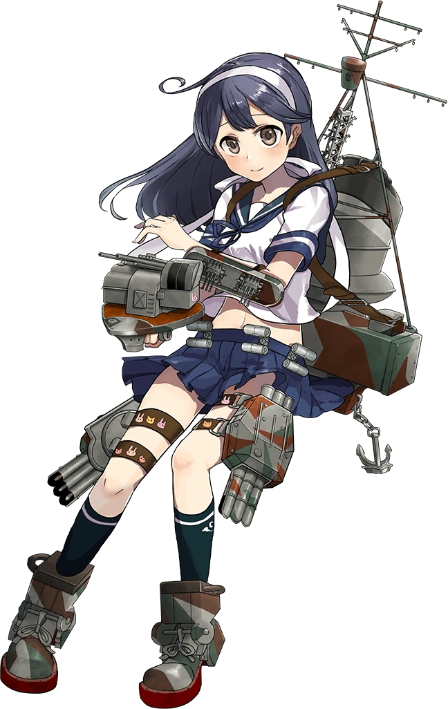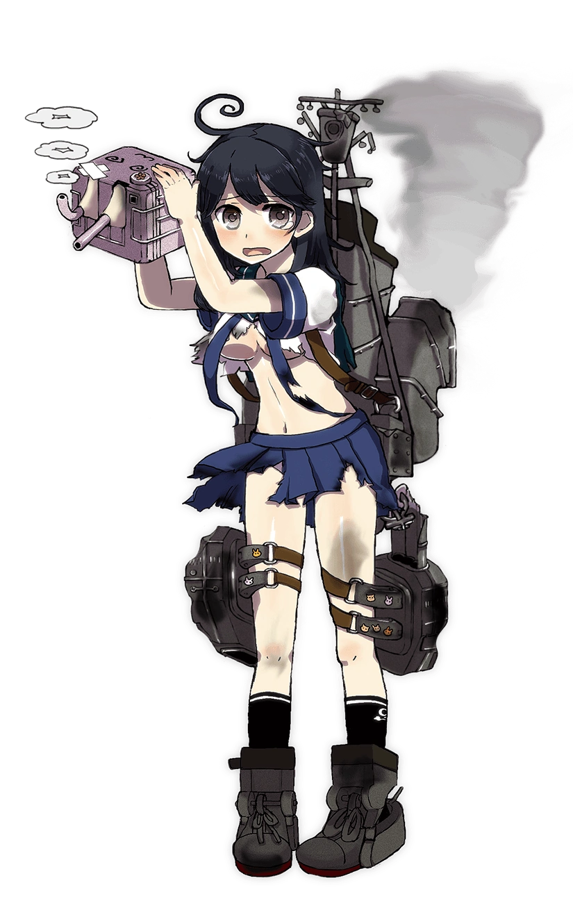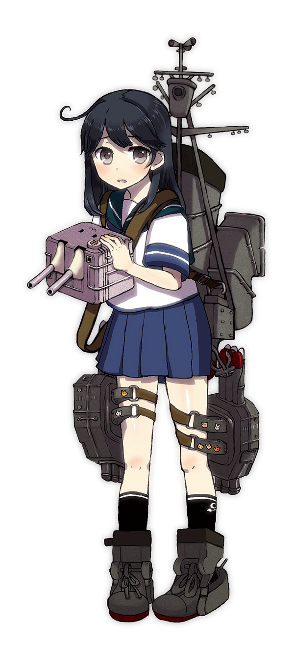 - She wears a serafuku and black knee-highs. Her cannon is pink, and which has a :3 face upon its top so that looking down at it, the cannon barrels look like ears on a bunny. She normally hugs her cannon tightly to her chest (to hide her chest, presumably). She has long black hair with a notable ahoge. The torpedo launchers strapped to her thighs have puppy, kitty, bunny, and other cartoon animal stickers on them.