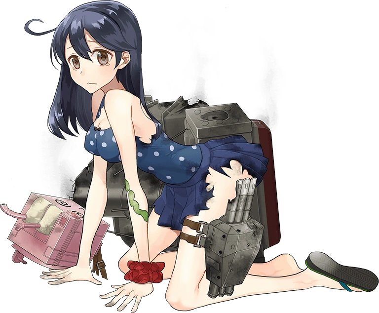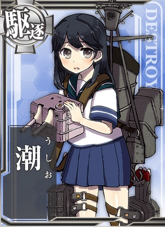 - Her most salient trait is that in her Official Art, after reaching medium damage, she pulls her cannon higher while her clothes were all but destroyed, revealing her surprisingly large breasts for a destroyer/young girl. (The reason for this may be that "Ushi" is the word for "cow", so she has "Ushi Oppai", or "cow tits", which is how some Japanese mock women with large breasts.) Many more recent destroyers have had large breasts, but prior to their introduction, she was the only destroyer with an explicitly large breasts in her official art, making her the "oppai loli". Even though Hamakaze has stolen a bit of her thunder, and there are a few others that have significant chest size, a combination of the fact that it had already become meme, and the fact that Ushio seems so shy about it makes her a particular target for large breasted little girl jokes.