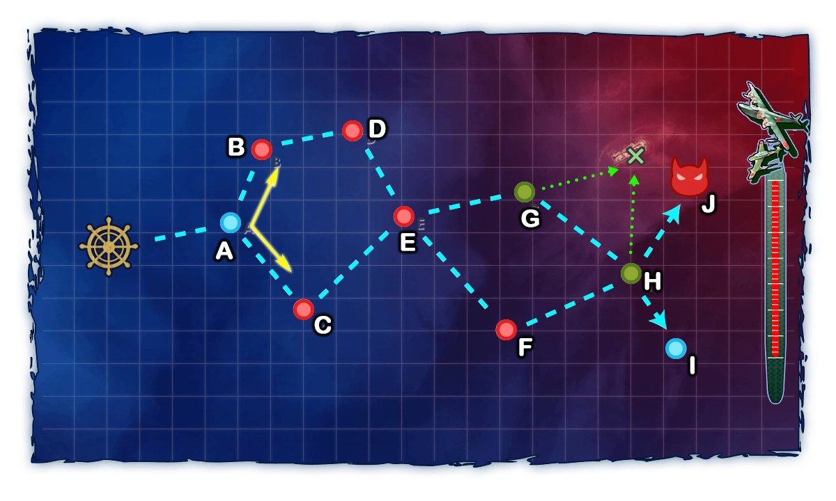 - A C E G H J: 1 AV + 1 CL + 4 DD or 1 AV + 1 CT + 1 CL + 3 DD (3 Battles Total)