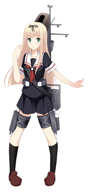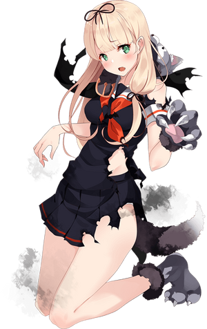 Yuudachi led the battle line to bombard Guadalcanal on 12 November; she took a lot of damage and Samidare rescued most of her crew. USS Portland later sank her off Savo Island - right in the "Ironbottom Sound". About her verbal tic 'っぽい' (ppoi), this is added onto the end of a word to signify a comparison or resemblance rather than the 'valley girl' version of like which is more like a verbal comma. For example kodomoppoi would mean something similar to child-like or childish. | |